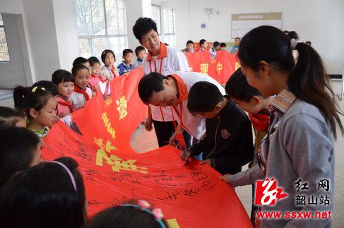 孩子们在横幅上郑重签下名字。 沈江摄