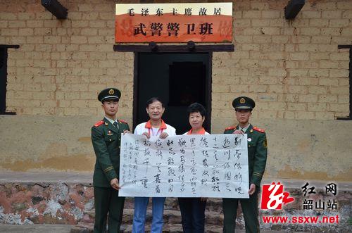 在韶山,王南阳来到了韶山学校小学部,与孩子们的进行了互动,看见可爱的小朋友,王南阳夫妇称赞不已,“真是可爱,一个个笑得天真浪漫。”当知道老人们要行走八个城市,小朋友们敬佩不已,纷纷用笔在“继承先辈遗志,实现中国梦想”横幅上郑重签下自己的名字。在毛泽东故居警卫班,王南阳夫妇向战士们送上带来的字画及字帖,王南阳老人还现场唱起一首自创的歌:“蓝蓝的天空白云飘,白云下面韶峰高;山歌一呀唱响四方,响呀麽响四方。青青的池塘荷花香,荷花映红上屋场;这里曾经出了个毛泽东,出了个毛泽东。”战士们鼓起热烈的掌声,随后一一签上名字,并合影留念。在故居前、毛泽东广场,了解了这对夫妇的举动,不少游客竖起了大拇指,作为支持,也提笔在横幅上签名。看到签名越来越多,王南阳劲头更足,“更有信心了!”