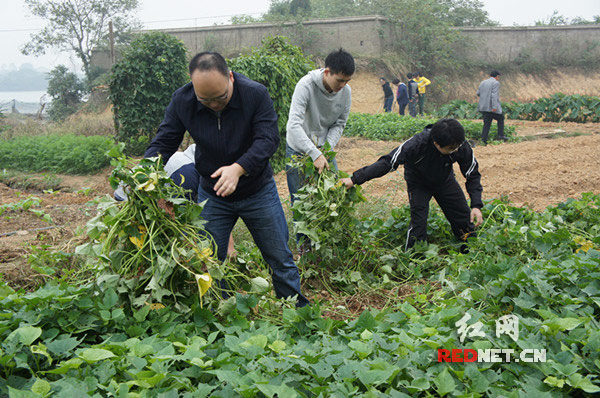 (青年干部深入田间地头和农民朋友一起割薯藤。)