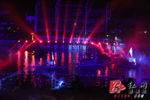 红网望城站10月25日讯(分站记者 刘赛)夜色深沉,高清LED显示屏闪耀,照亮了以古镇为背景的主舞台,擦亮了所有观众的眼球。中国首部还原靖港古镇百年历史的实景演出《靖港故事》拉开了首演的帷幕。来自全世界的峰会嘉宾及众多国内外媒体代表齐聚望城,一起“穿越”到了159年前曾国藩率军水上大战太平军的历史场景。