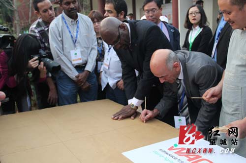 峰会活动与会代表按下手模做留念。解巾英 摄