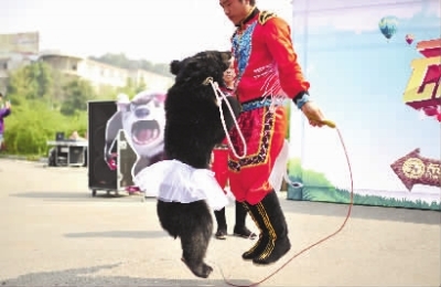 一年一度的动物狂欢节即将开幕,工作人员带着动物们在彩排。 记者 童迪 摄