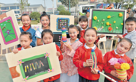 芙蓉区马坡岭街道的孩子们大展创意,将扣子、树叶、啤酒瓶盖等小物品组成一件件创意作品。 陈飞 摄