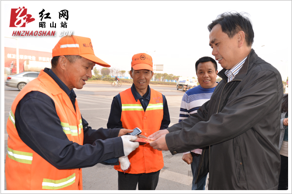 10月26日,昭山示范区党工委副书记、管委会主任成秋兴(右一)为环卫工人送去节日的问候。