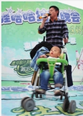 娃哈哈格瓦斯社区好声音上,曾宾保爹爹推着自己1岁零9个月的小孙子上台唱歌。