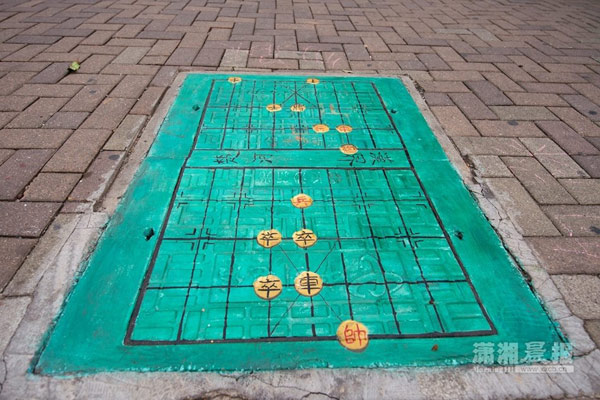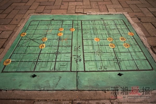 10月28日,记者在通程文化广场看到,在“蜘蛛侠”井盖旁边10米开外的一个长方形的井盖则披上了绿色盛装,上面变成了一副棋盘,绘有楚河汉界,摆着一副象棋残局。