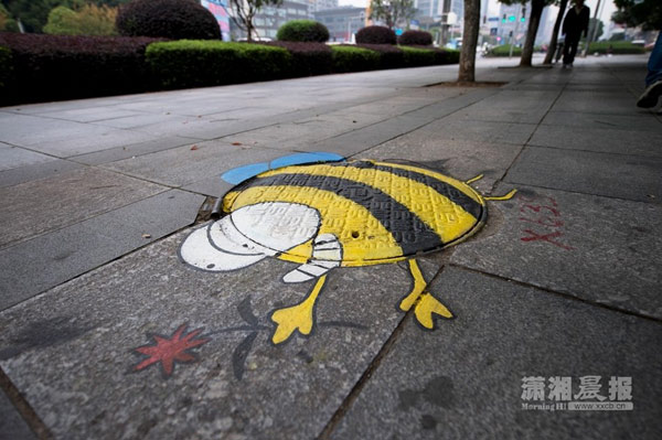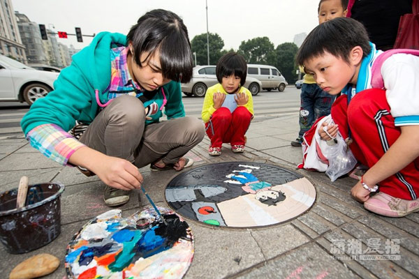 相关链接:长沙县城管在井盖上涂鸦彩色图案 美化城市又提醒行人