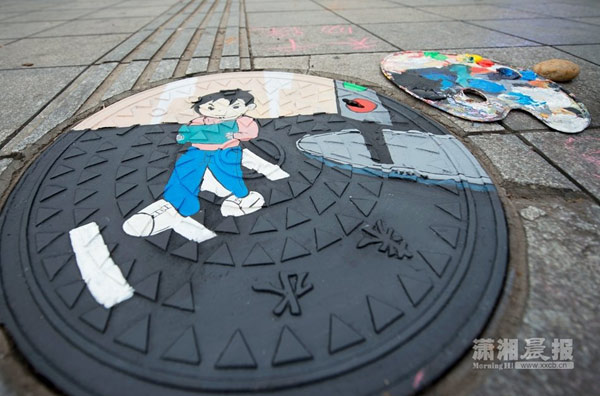 长沙县是从10月22日开始进行这项工作的,除了在通程文化广场附近给井盖披上卡通盛装外,还将在其他热闹繁华街道的井盖上绘制卡通形象。