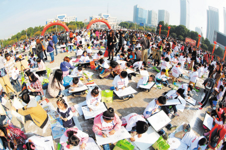 本报讯(记者 刘军 实习生 王艳明)高楼大厦为背景,一个垃圾筒格外显眼,一位小朋友手里拿着一张废纸,正准备将其丢进垃圾筒……这是5岁的王玥文小朋友的画作《文明从我做起》。前日,在长沙县举办的 “昕雨阳光杯”第三届广场书画大赛上,1500名孩子用手中的笔酣畅淋漓地表达了自己对文明与幸福的理解。但从作品上来看,孩子们的作品“成熟有余童趣不足”,中规中矩。