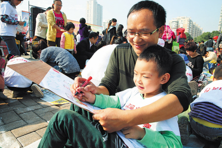 上午9时30分,随着主持人一声“开始”,活泼可爱的孩子们迅速拿起五彩蜡笔和油彩开始作画。此次书画大赛的主题是“文明星沙·幸福家园”,11岁的陈桐宇画了一幅小朋友在公交车上给老人让座的画表达文明;8岁的小朋友孙诗瑶画了几个小朋友在街上捡垃圾表达文明……在比赛现场,记者注意到,孩子们作画时,选择的内容大致相同:表达文明就是捡垃圾、让座;背景大多是蓝天白云、宽敞通达的马路、绿意盎然的树木。在比赛现场,记者还注意到,不少家长就蹲在孩子的旁边,指点孩子如何表达“文明与幸福”主题。有的家长甚至亲自动手帮助孩子“更正”自己看着不满意的部分。