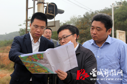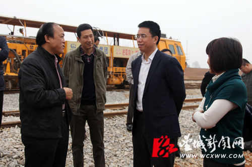 望城区委副书记、区长孔玉成(左一)详细了解石长铁路增建二线(望城段)的建设情况。(姚泽子 摄)