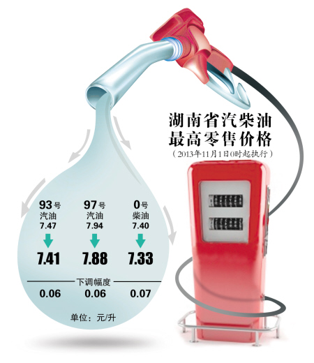 在国家发改委宣布调价后,湖南省内的中石化、中石油加油站的汽柴油零售价格也在今日零时作出调整,具体价格为:93号汽油7.41元/升,97号汽油7.88元/升,0号柴油7.33元/升,每升分别下调了0.06元、0.06元、0.07元。在中石化各大加油站如果选择自助加油,还可以享受每升5分钱的优惠。