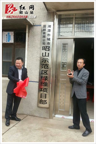 昭山示范区党工委委员、总工程师李白杨(右)和湘潭市园林管理局党委副书记、局长张浩然(左)共同为项目部揭牌。