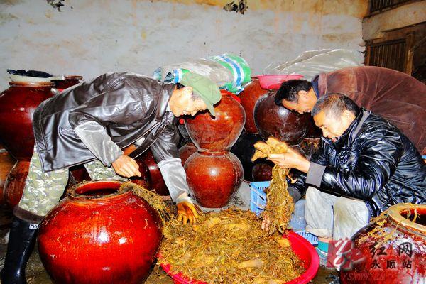 永顺县科技特派员谢锃锴为高坪乡西米村引进大蔸菜加工企业,通过“公司+企业+基地+农户”的经营模式,免费为种植户供种、技术指导,按市场价格回收产品,带动全县5个乡镇2000余亩大蔸菜产业发展,季节性为民创收400余万元。图为11月6日,该村农民在大蔸菜加工厂生产加工大蔸菜。通讯员唐其柏 摄