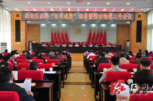红网雨湖站11月6日讯(分站记者 谢岳峰) 11月4日,湘潭雨湖区委书记刘永珍主持召开全区征拆“百日攻坚”动员暨信访维稳工作会议。刘永珍强调,全区上下要众志成城,团结一心,全力投入到征拆“百日攻坚”战当中,采取过硬的措施,无条件服从安排,确保工作取得成效。
