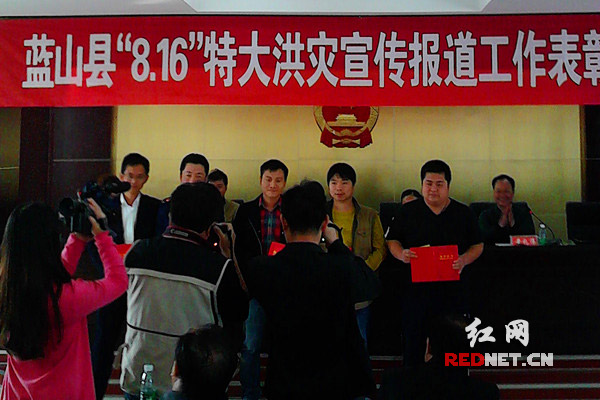 红网蓝山11月8日讯(通讯员 赵彬 李果娜)今天是第14个记者节。上午,湖南省蓝山县举行“8.16”特大洪灾宣传报道先进个人表彰大会,总结宣传报道工作经验,表彰抗灾报道先进个人,黄永翔等21名表现突出的新闻宣工作者受到表彰。