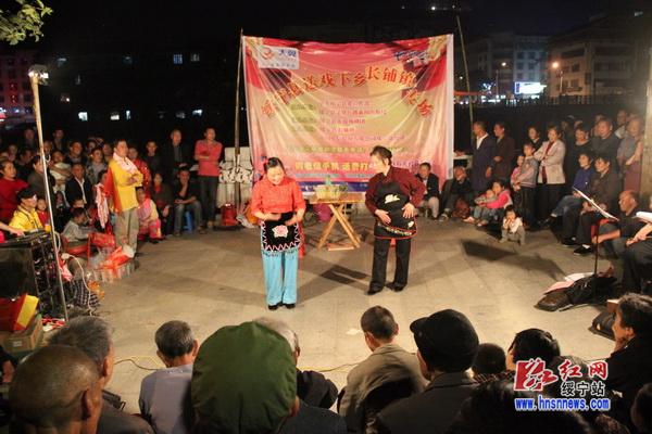 红网绥宁站11月12日讯(通讯员 向云峰)11月9日晚,绥宁县花鼓戏剧团的演员们在长铺镇表演花鼓戏,为市民朋友们带来了精神上的愉悦和心灵上的满足。据悉,绥宁县花鼓戏剧团的演员是爱好花鼓戏的退休老干部和市民。近年来,绥宁县委宣传部、县文广新局经常开展“送戏下乡”,提高广大群众思想道德素质、科学文化素质、健康素质,丰富和活跃农民文化生活。