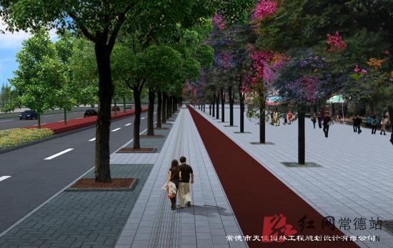 下层地被采用简洁通透的形式,取消行道树绿化带,改为2米*2米的树穴,以时令草花与红叶石楠相结合(重要节点及交通渠化岛等处栽植时令草花,其余地段栽种红叶石楠),突出繁花似锦及景观效果。人行道绿化带计划采取渗水砖铺装,树穴满铺松鳞片,人行道外侧栽种栾树。