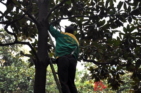 施工现场,市园林局抽调了近40名经验丰富的树木"发型师",给树木"理"一个"精干发型"。为了不影响交通,市园林局还专门安排了4台机械车紧跟“发型师”,及时将枯死树枝等清运出去。“预计到明天为止,武陵大道和洞庭大道两旁树木修剪工作就能完工。”市园林局建设科负责人叶子建告诉记者。