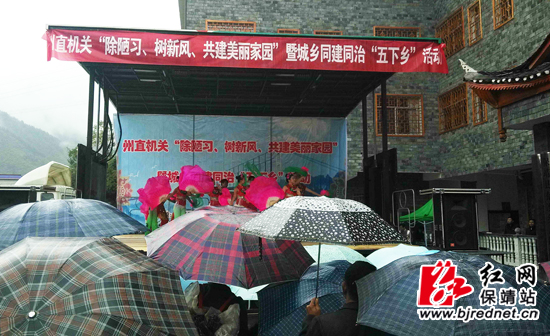 红网保靖站11月13日讯(通讯员 吴晓东 杨凡)11月12日,天空飘着毛毛细雨,由湘西州直机关工委牵头,州卫生局、州司法局、州文广新局、州科协联合举办的“除陋习、树新风、共建美丽家园”暨同建同治“五下乡”活动在保靖县夯沙乡政府广场拉开了帷幕。