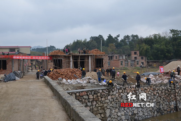 红网蓝山11月14日讯(通讯员 黄曦)湖南省蓝山县大麻办事处林布村曲龙尾自然村共44户、161人。“8·16”特大洪灾中,该村受灾128人,倒损房屋12户,其中全倒户8户。目前,8户受灾群众的住房全部按照高标准规划建设,均已完成一层主体,计划11月30日前完成二层主体,年内灾民搬进新居。图为11月13日,天气稍霁,大麻办事处林布村便到处充满了一片热火朝天的劳动景象。