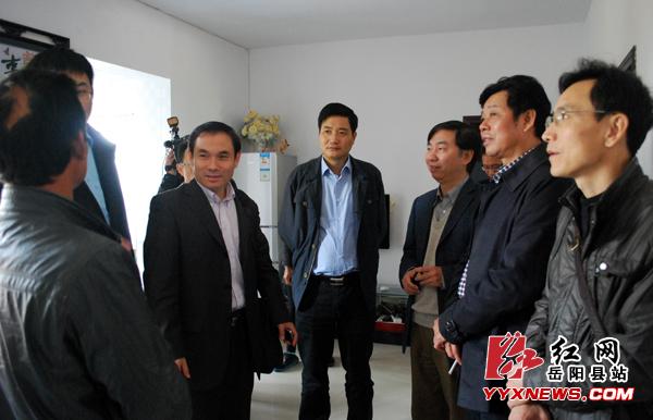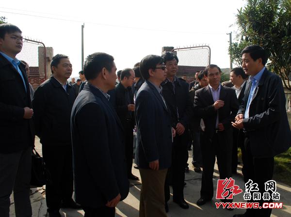 (岳阳县委副书记、县长张中于向考察人员介绍渔民安置点情况)