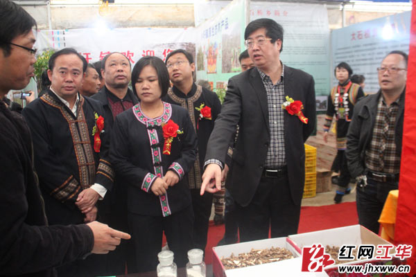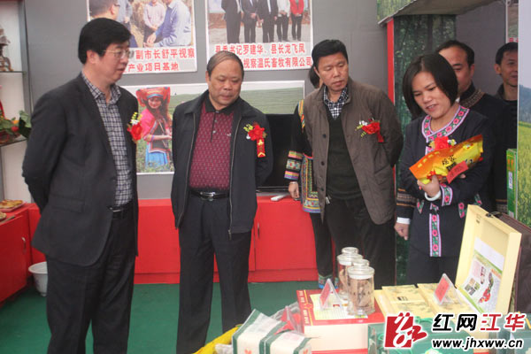 县委书记罗建华、县长龙飞凤及嘉宾参观江华特色农产品。(唐建国/摄)