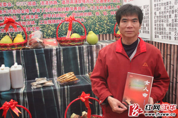 “听说今年盘王节活动县里举办首届农产品博览会,为各地各部门提供参展农产品的标准展台。我想自己作为一名农民作家,在精神文化上也应该有个农产品,于是通过与筹委会汇报,同意了我参展农作品《女人书》等试展200册,今天上午开幕式就有很多客商前来咨询,真是太感谢筹委会了,为我们瑶胞农民充分提供了展示体力与脑力农产品杰作的舞台。”据农民作家唐自水现场介绍,《女人命》一书共约32万字。该书讲述的故事发生在上世纪七十年代末八十年代初的湘南的偏僻小山村,描写了一个困惑在封建世俗、陈旧观念的思想内走向灭亡,另一个敢于挑战旧观念而获得了美好新生活的两个女性的不同命运。该部作品用尖锐、深刻的笔触,发人深省地细腻地剖析了当前少数农村中由于重男轻女封建思想所造成的种种惨剧,热情地讴歌了大部分敢于挑战旧观念而获得了美好新生活的新农民。