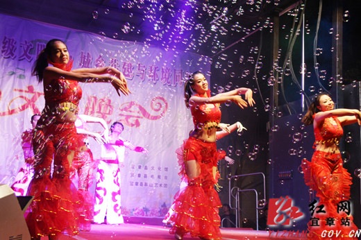 晚会以优美动人的舞蹈《美丽中国》拉开了序幕。紧接着,现代舞《cry me out》绚丽登场,洋溢着活力与动感;小品《孙二娘》在一评一说之间,倡导大家讲文明、树新风;歌伴舞《呼唤》为观众们展示出了魅力宜章、美丽宜章的韵味;每个节目都向广大群众宣传了我县“创文”工作的广泛和深入民心。整场晚会高潮迭起,掌声、欢呼声此起彼伏。最后,晚会在舞蹈歌伴舞《呼唤》中落下帷幕。