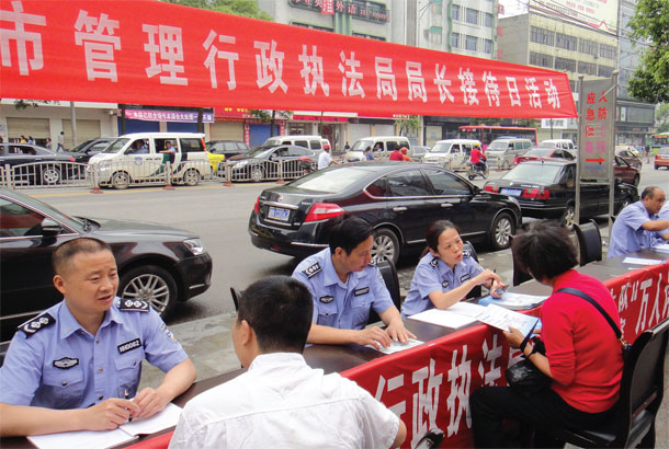 怀化市城市管理行政执法局的“万人评百人”评议对象走上街头为群众现场释疑解惑,解决困难。
