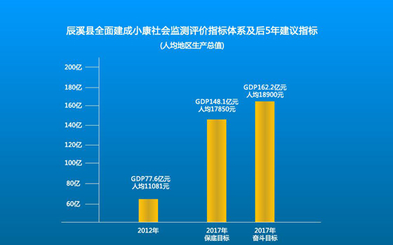 GDP是衡量一个国家经济发展状况的指标,人均GDP是衡量这个国家人民生活水平的一个标准。2012年,辰溪实现地区生产总值77.6亿元,人均11081元。按照县委十一届三次全会为辰溪全面建成小康确定的目标,到2017年,辰溪GDP要达到148.1亿元,人均17850元,年均需增长10.1%。
