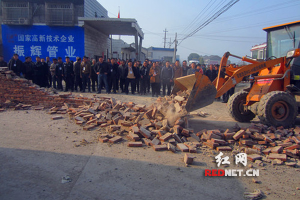 镇区加油站的违章围墙搭建以来,给镇区群众加油带来了极大的不便,镇政府在接到不少群众要求拆除的建议与举报后,多次与非法搭建人员协商,要求其自行拆除,却一直未见其行动。在这次拆除行动中,镇政府出动挖机对此违章围墙依法依规进行了拆除,过程中,虽遇到小部分群众的阻拦,但是队员们秉着文明执法的原则,耐心细致地做着劝解,全力将群众控制在拆除的安全区域内。