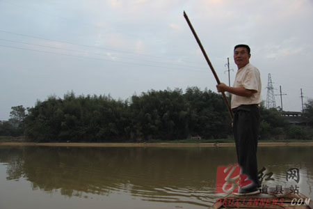 图为傍晚小鸟归巢时,吴荣山划船巡查。