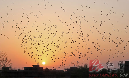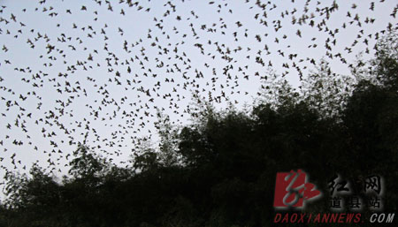 图为傍晚,成千上万归巢的小鸟。