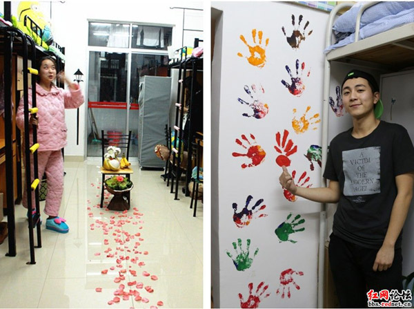 男生寝室(右图):这往墙上涂抹也能算艺术。你这巴掌印是有点想让寝室成为艺术工坊吗?咳咳!帽子不错,还是个帅小伙儿!