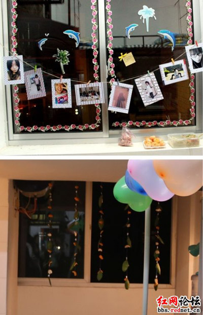 大一军训与运动会的纪念相片,记录梦想和希望的许愿卡片,宿舍每个人的有趣外号和搞怪照片,每一张都记录了自己的成长。动漫的海报,精致的手绘,用心的美食,每一样都载满了对小家的爱护。当问到为什么将宿舍取名为“天使宝宝”时,几位女生不好意思地笑着说:“因为我们宿舍的女生以后想要有天使一样可爱的宝宝……”每个宿舍,都有一个故事,宅人也会有春天。