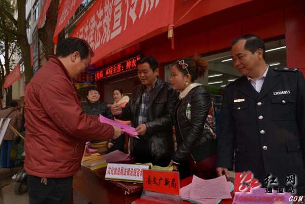 红网通道站12月5日讯(通讯员 张红 李菲 陆慧)12月4日,通道在商贸广场开展以“大力弘扬法治精神、共筑伟大中国梦” 和“加强普法依法治理,促进新型城镇化”为主题的“12·4”全国法制宣传日活动。