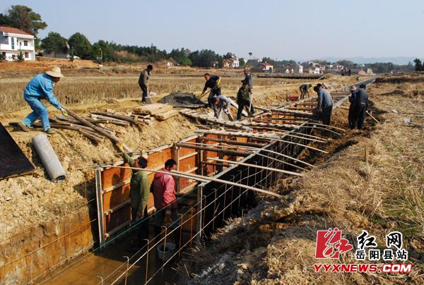 红网岳阳县站12月10日讯(分站记者 吴拥民 彭会 通讯员 许国湖)“突突……”,路边的汽油发电机传来阵阵轰鸣,12月9日,岳阳县农业综合开发柏祥镇鹅咀村的黄泥淑排水渠道硬化工地上,一群穿着套鞋、戴着帆布或橡胶手套的施工人员在机器的“伴奏”声中,忙活着铲土、装模、挑运水泥、上料、夯实……300米外的混凝土搅拌机前,3名施工人员默契配合着将已经配好的“料”装上车;一辆迎面而来的手扶拖拉机扬起一路尘土,2个现场施工人员赶紧拥上前,将车上的混凝土麻利地卸了下来,挑去了工程的“最前线”;接过送来的混凝土,施工员给已经筑好的土模上上“料”,负责“打棒”的人紧随其后,用振动棒将刚浇灌下的混凝土一一捣实……进场21天来,22名施工人员每天扎根工地、循环操作着这些工序。他们的身后,是一条长510米,宽2-2.5米、深1.5米、笔直畅通无阻的全新混凝土排水渠。
