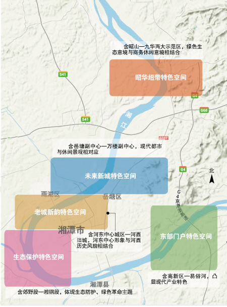 老城新韵特色空间,含河东中心城区—河西旧城,以宝塔公园、体育公园等核心的河东中心形象与以雨湖、文庙、城正街等河西历史风貌景观相结合的新老城区特色空间;