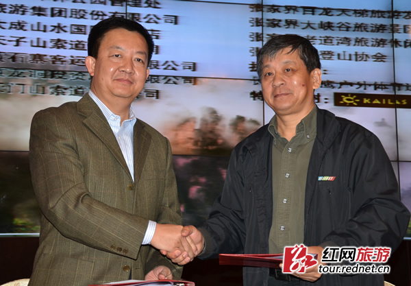 张家界市委常委、副市长程丹峰(左)与中国登山协会代表签署合作备忘录。