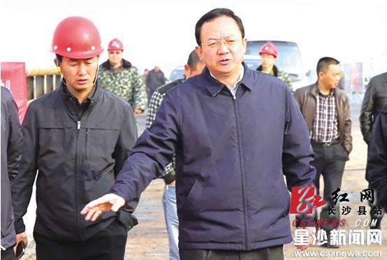 昨日上午,长沙县委书记、长沙经开区党工委书记杨懿文(前排右)在黄兴大道南延线施工现场调研,了解项目进展情况。章帝摄