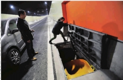 12月12日下午,长沙市南湖路湘江隧道南线,记者体验开启逃生通道阀门。 记者 田超 摄
