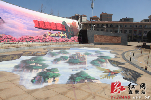 这幅名为《宜章迎客松》的广场3D手绘画,总面积达1200多平方米。它以莽山为创作背景,将县花杜鹃、莽山迎客松、风景名胜将军石等独具宜章特色的元素融入其中,市民只要在广场走走就能观赏到宜章优美的自然风光。