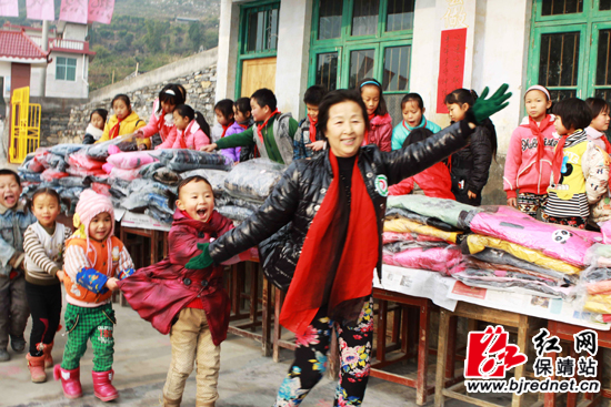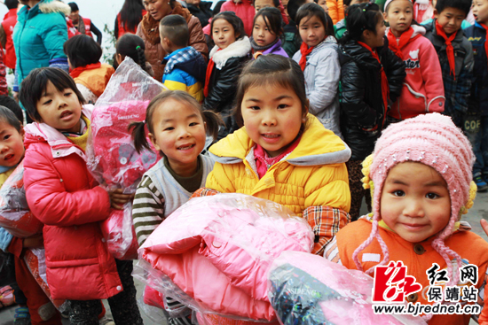 领到衣物的留守儿童