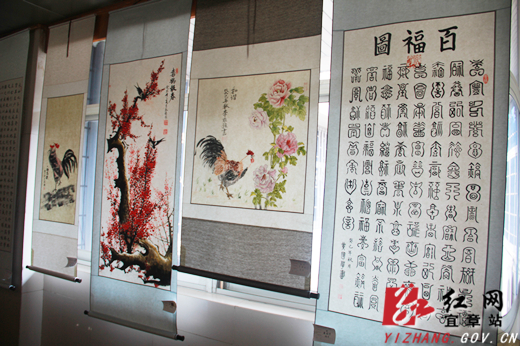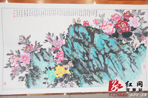 此次书画展从12月14日起在郴州市展出了4天,随后便在各县市区开展巡回展出。宜章是此次巡回展的第一站,展出为期3天。记者看到有两幅作品深受观众喜爱,一幅是宜章县老年书画协会会长吴绪耀老先生的作品《芬芳玉洁》,画的是高雅富贵的牡丹。他说,牡丹代表富贵,象征全国全县人民都富裕起来了。还有一幅特殊文字的书法作品,吸引了大家的目光。据介绍,这种文字是少有人知道的江永女字,宜章县只有2个人掌握,罗卫罗老先生就是其中一位。