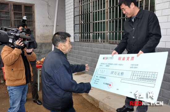 (农村危房改造爱心援建户代表周拥军接受爱心捐款。)