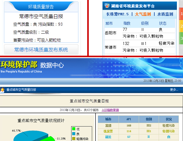 截至记者发稿时(12月20日23时),常德市环保局网站发布大气污染指数为93,空气质量“良”;湖南省环保厅公布常德市大气污染指数为132,空气质量“轻微污染”;国家环境保护部数据中心发布全国62个重点城市监测数据,其中常德市大气污染指数168,空气质量“轻度污染”。