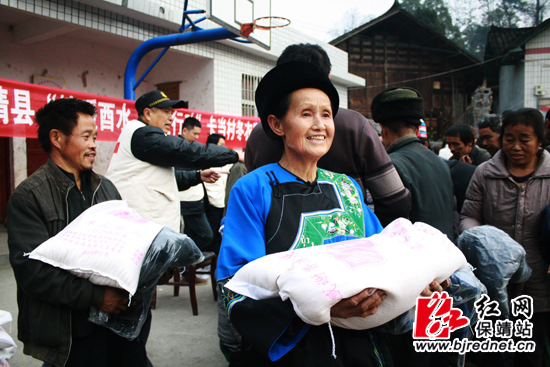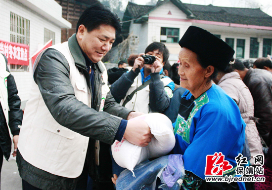 保靖县委副书记宋宗江为村民发放大米、冬衣 彭运生 摄