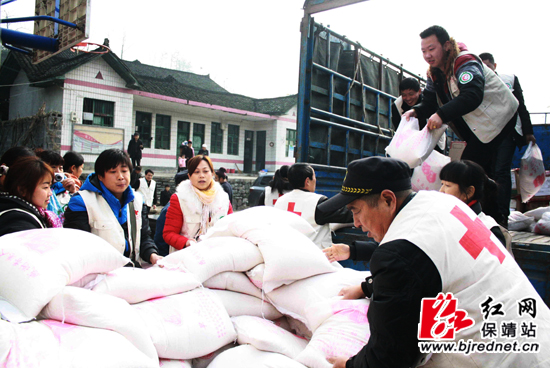 活动现场,志愿者们帮助卸下大米 彭运生 摄