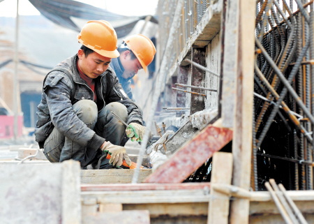 工程施工现场,工作人员正抢抓工期,加紧施工。均为王志伟 摄